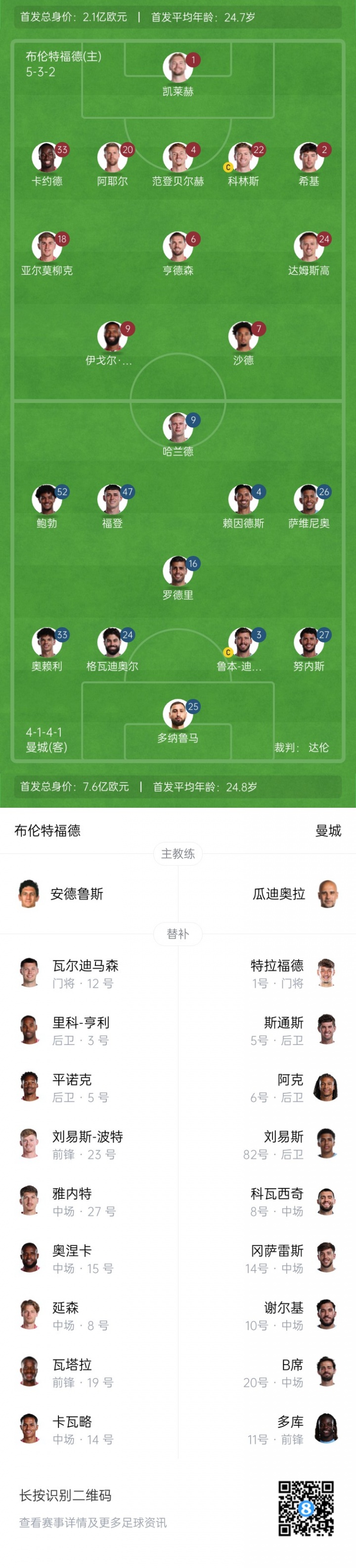 10月05日讯 北京时间今晚23点30分,英超第7轮,曼城客场对阵布伦特福德,赛前双方公布首发阵容。